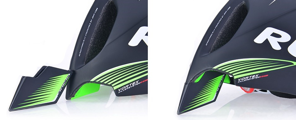 WING57 TT头盔相对于Wingspan最大的改进就是更加科学地设计了头盔几何和两侧进气口,其目的是引导头盔后部的气流更快速的通过,骑行时头盔后部的乱流、两侧不稳定气流、划过脖子和肩膀的不同速度的混乱气流都是不利于提升速度的因素,而VORTEX KILLER系统则能够有效地引导这些气流能够快速的流过。这个系统增加了头盔内部气流流通的速度从而形成一个高/低压区,使正面和两侧的空气能够快速流过。同时加快空气的流动也意味着头盔拥有更好的通风性能,提高汗水的蒸发速度,降低头盔内部温度,保持头部舒适。以上两项改进能够大大的降低整体风阻,降低风阻就意味着能够在分秒必争的TT赛和铁人三项赛中抢得先机。